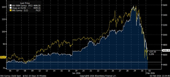 Last week saw extraordinary volatility in commodity markets, especially in precious metals. Gold surged to record levels, briefly topping $5,600 at one point as investors sought safe-haven protection amid rising global uncertainty. However, profit-taking took hold, as the announcement of a ‘moderate’ for the Fed Chair role prompted a rebound in the dollar. The yellow metal experienced one of its steepest intraday falls in recent memory, slipping around 10% or more at times from peaks to troughs. The drop in silver was even more violent, with single-session declines approaching or exceeding 30% as forced liquidations and compressed liquidity amplified moves. With Shanghai closed for the Lunar New Year and no price discovery in Asia – selling pressure intensified on COMEX, already stretched by speculative positioning and a March contract leverage ratio of nearly 5:1. The result was a dramatic and disorderly repricing that underscored just how unstable precious metals markets have become.