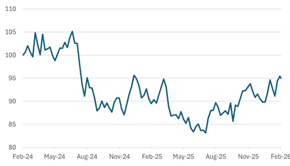 Takaichi’s proposed two-year suspension of the sales tax on food would inject approximately five trillion yen into the economy. Fiscal expansion layered onto gradual monetary normalisation has the potential to alter earnings trajectories, particularly for exporters and defense-adjacent sectors. The Nikkei responded decisively. The yen remains weak. This dynamic highlights the potential impact of currency movements on international equity returns, particularly where earnings acceleration coincides with FX volatility.