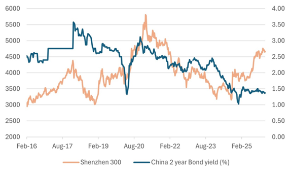 China met its 5% GDP growth target in 2025 despite export headwinds from the United States, as stronger trade with ASEAN and Belt and Road partners offset those headwinds. The deposit maturity wave creates a durable domestic liquidity tailwind. This is not about short-term stimulus headlines – it is about household balance sheet behaviour potentially shifting to risk assets at scale. That being said household confidence remains low and it will be a leap of faith, or excitement about equity market gains, that motivates households to spend or save in riskier assets.