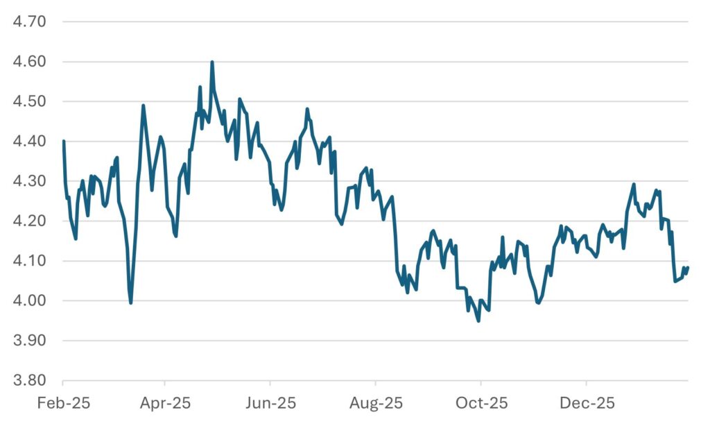 In that context, a 10-year yield of 4.0% may not fully reflect a backdrop of fiscal expansion, policy volatility, and geopolitical fragmentation. Any adjustment in long yields would likely influence domestic financial conditions and global asset allocation dynamics.