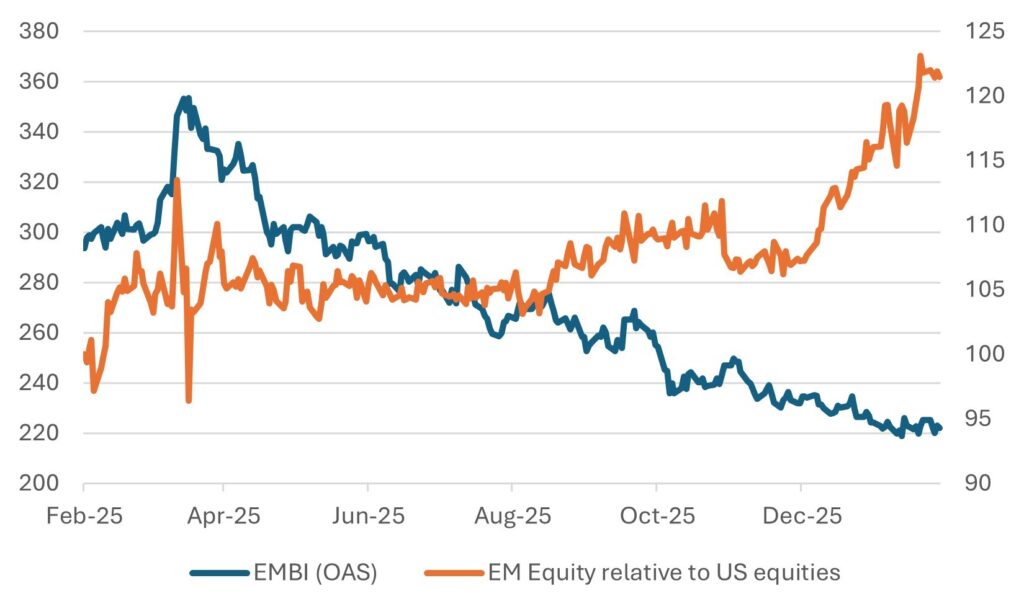 OAS (rhs), EM equity relative (rhs, rebased to -1Y=100)